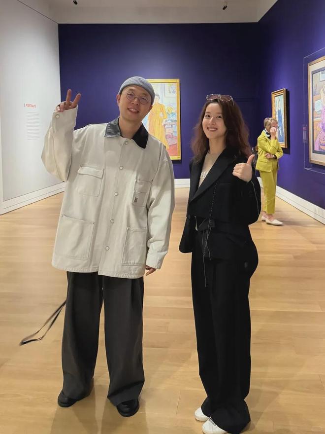 把看展当成日常的她,还偶遇了杜海涛,大笑合影满满生命力。穿Sacai解构西装,脚踩Golden Goose小白鞋,简约低调。