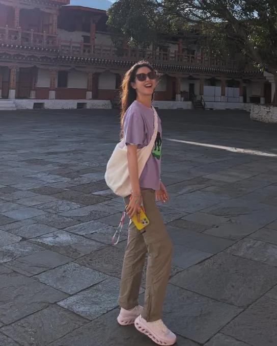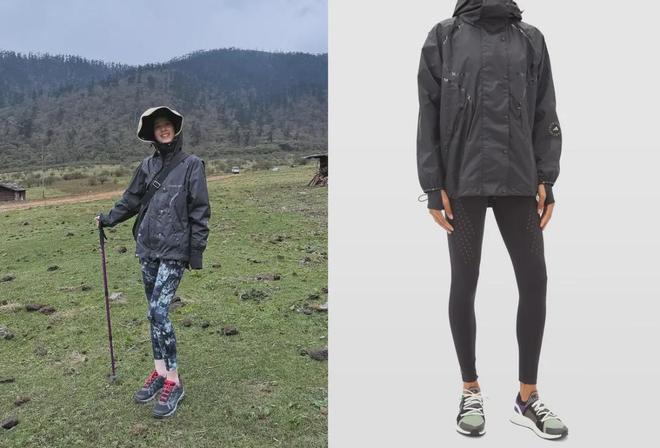 户外徒步时必穿功能性服饰,应对多变的风雨天气。在不丹时就穿了一件低调的纯黑款冲锋衣,来自Adidas by Stella Mccartney联名系列。