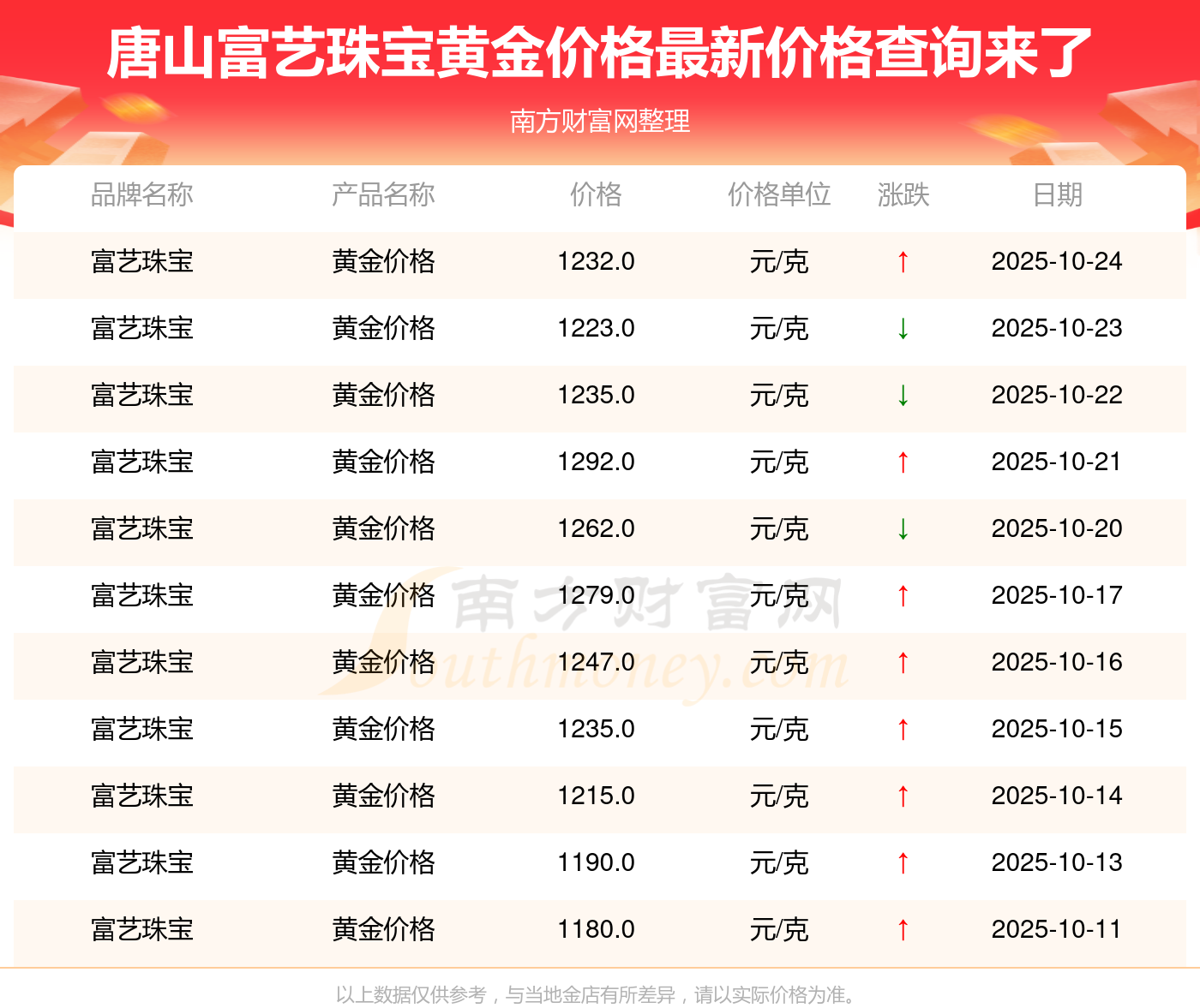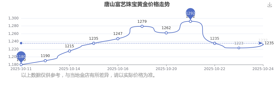 2025年10月26日这一天,唐山富艺珠宝的黄金价格以 1232.0元/克的价格售卖。